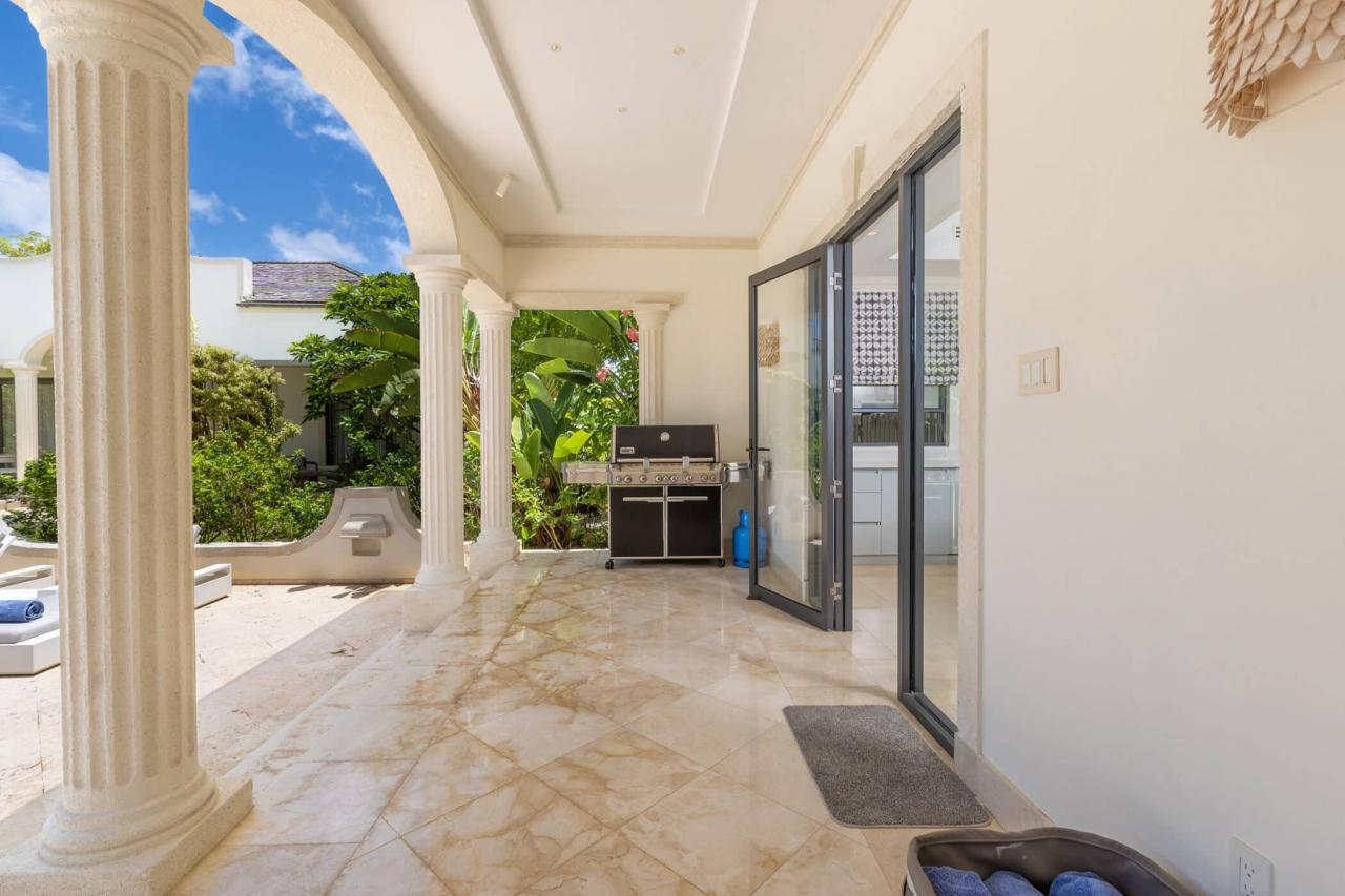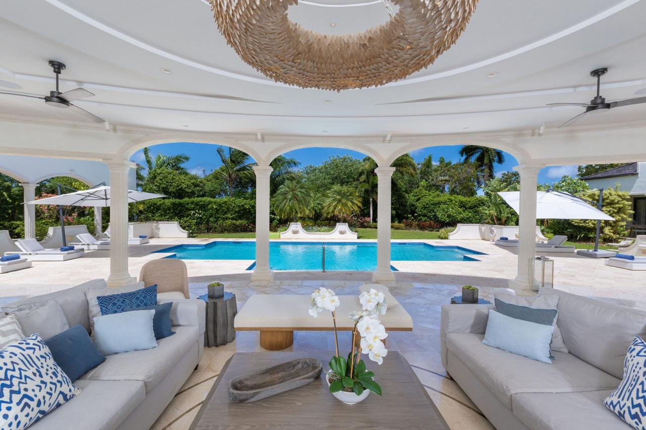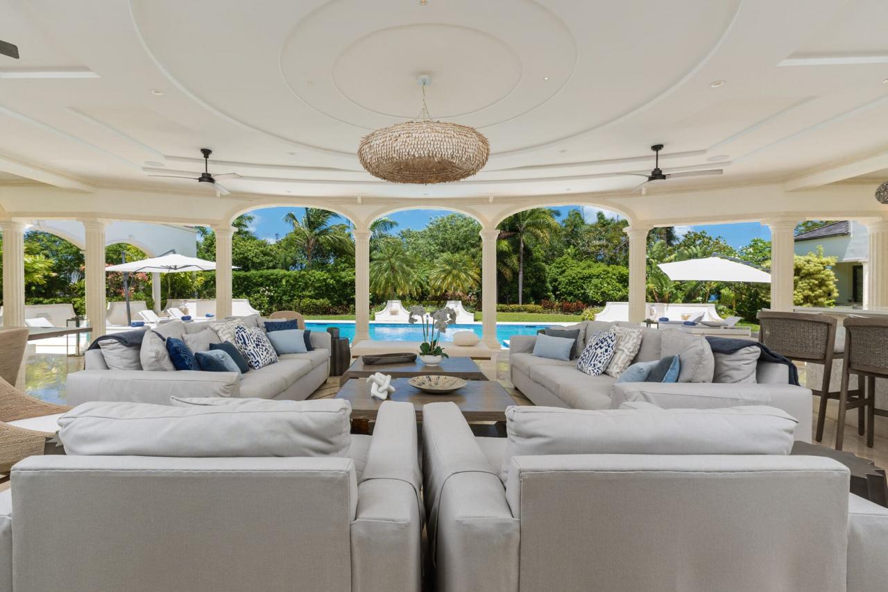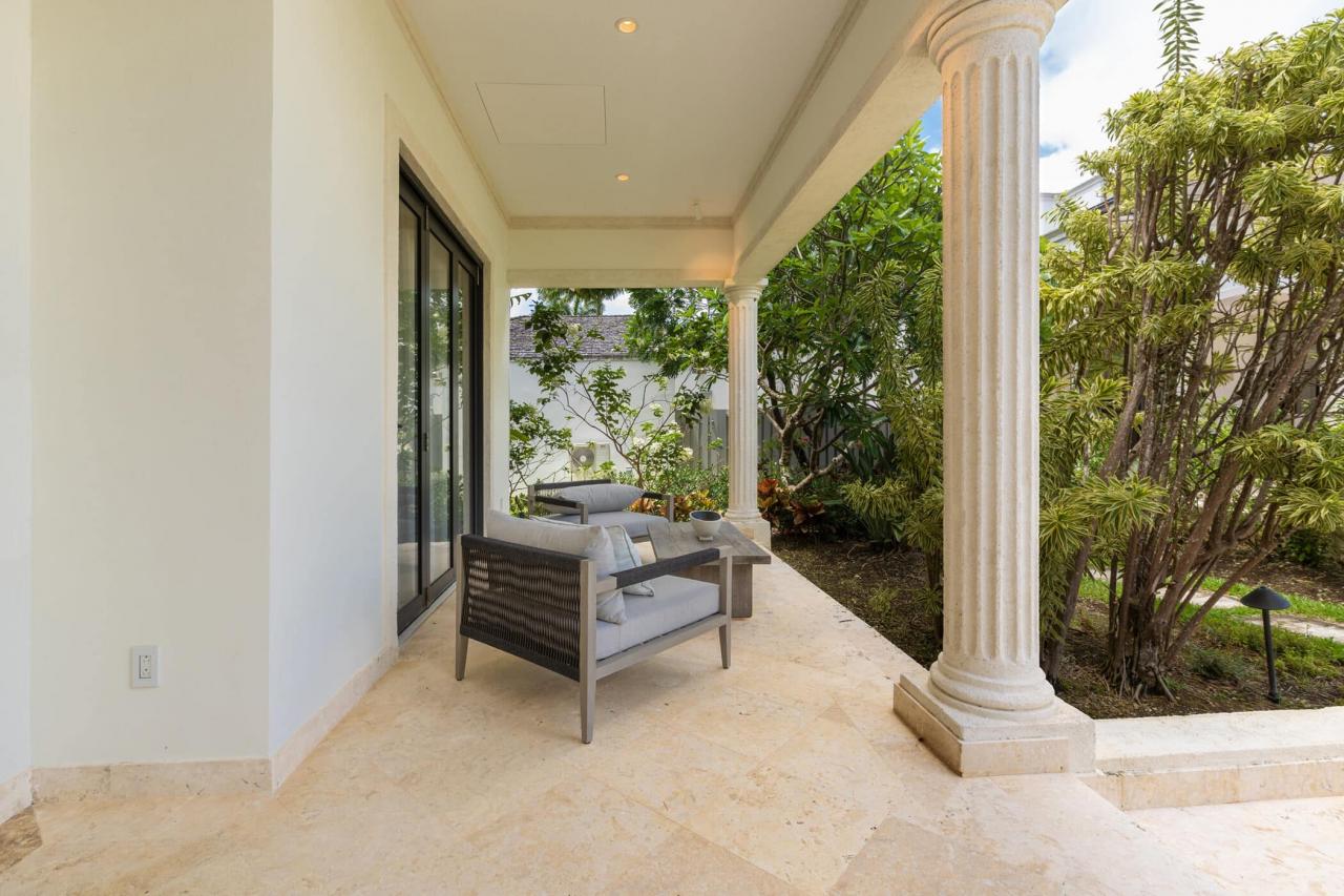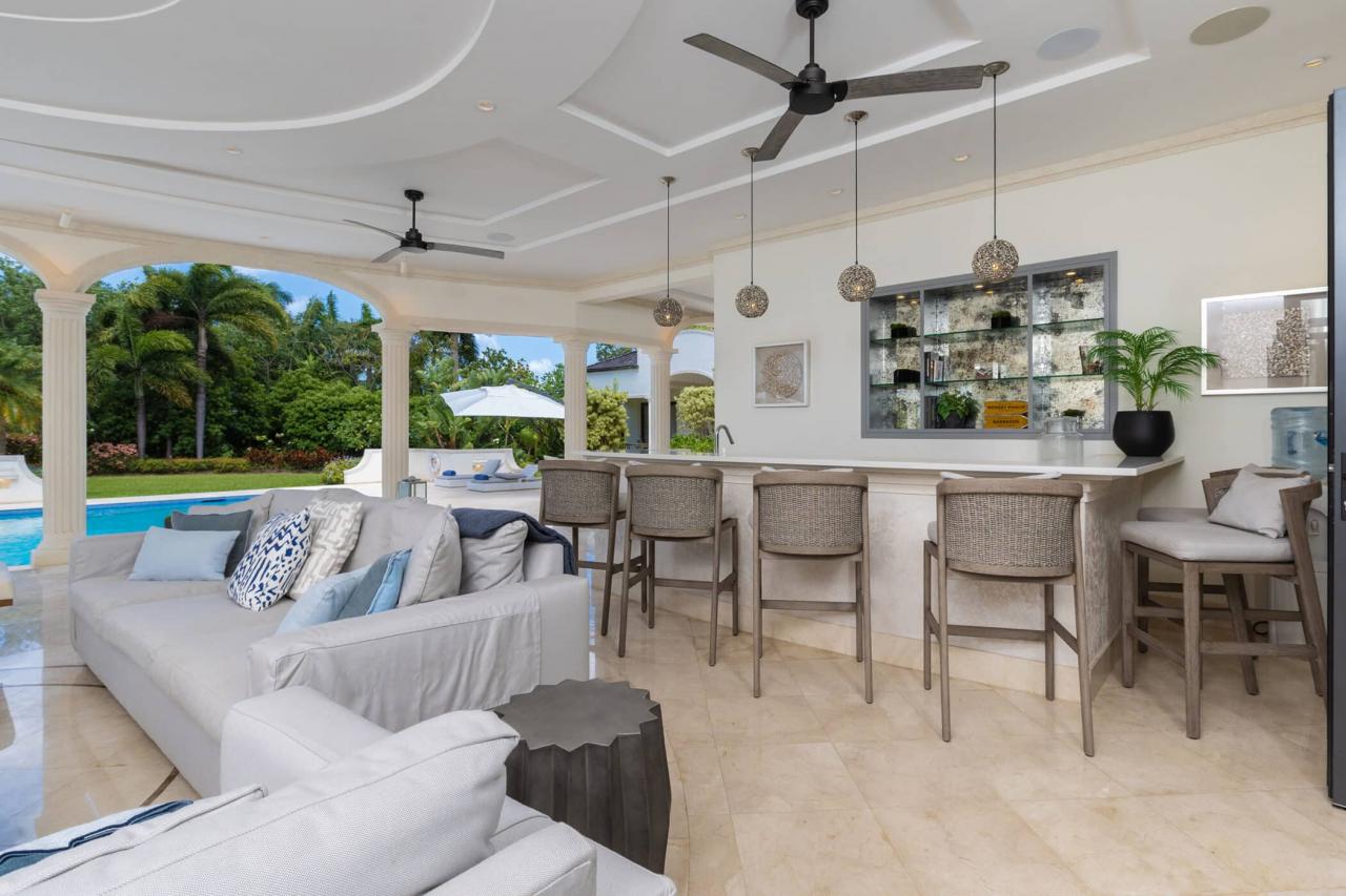 Outdoors, a private 50-foot swimming pool anchors the lush tropical gardens, surrounded by a covered terrace and elegant lounging areas perfect for both sun-soaked afternoons and intimate evening gatherings. An open-air bar, espresso station, BBQ area, and piano lounge create inviting spaces for entertaining, while the fully equipped kitchen and spacious dining area cater equally well to relaxed breakfasts or formal dinners.