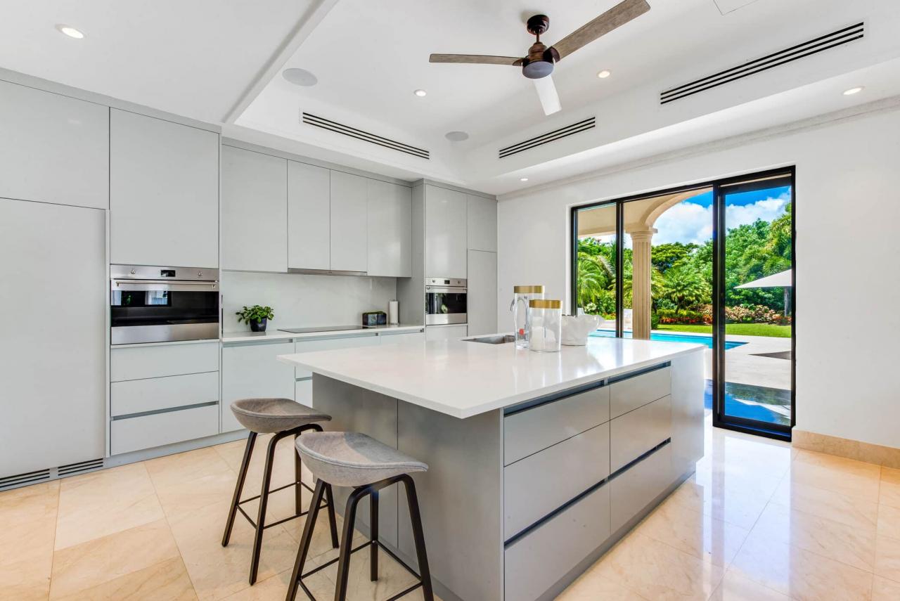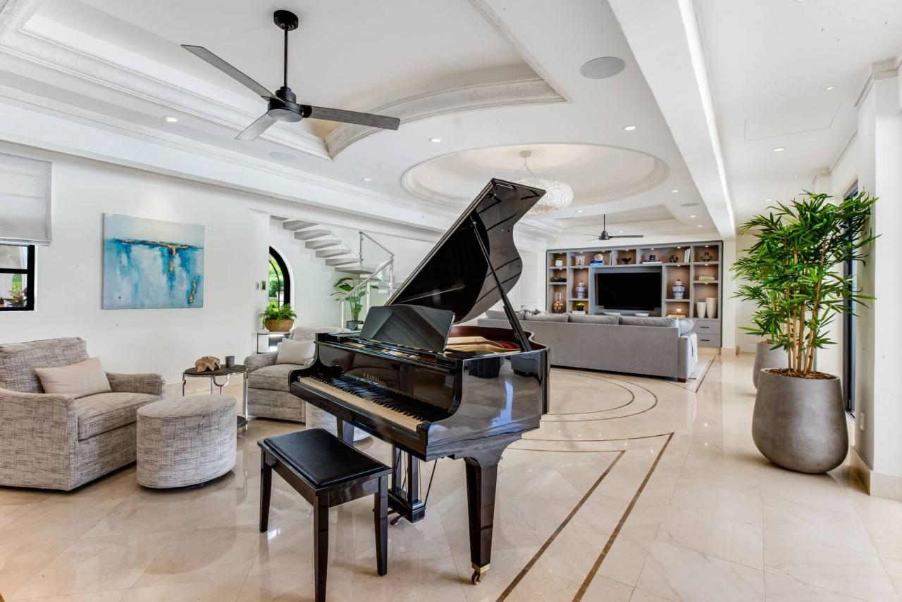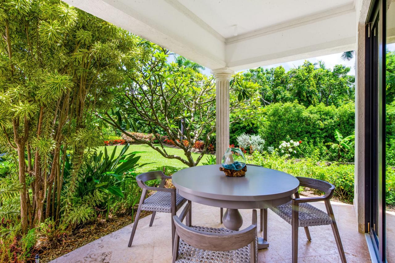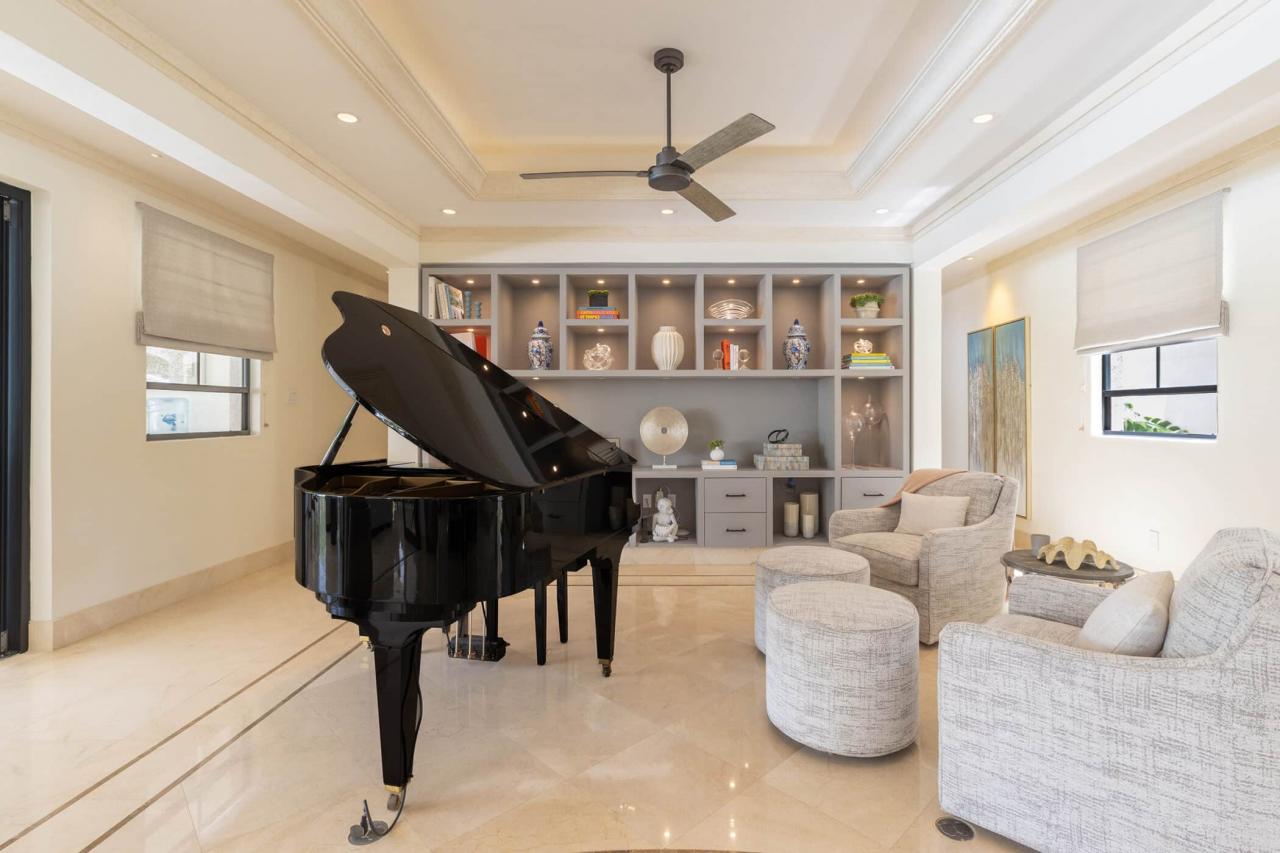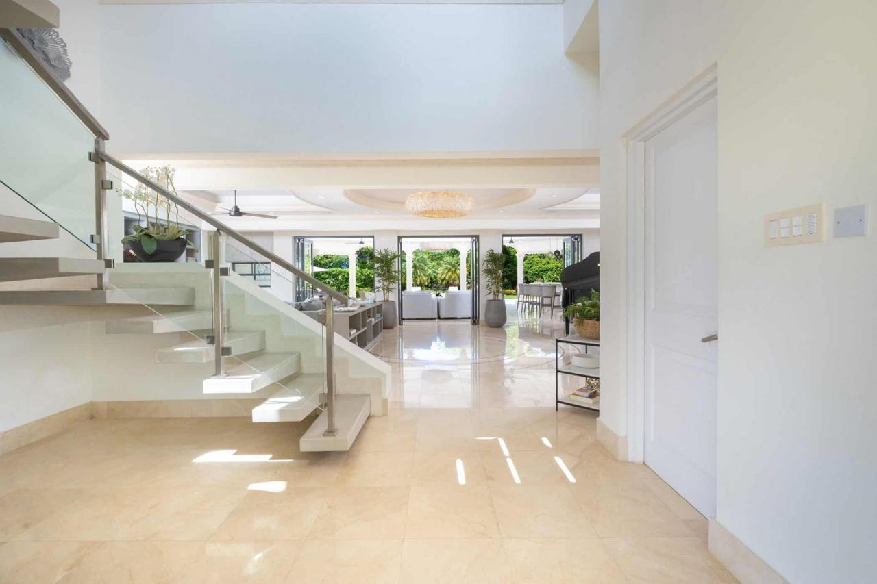 Outdoors, a private 50-foot swimming pool anchors the lush tropical gardens, surrounded by a covered terrace and elegant lounging areas perfect for both sun-soaked afternoons and intimate evening gatherings. An open-air bar, espresso station, BBQ area, and piano lounge create inviting spaces for entertaining, while the fully equipped kitchen and spacious dining area cater equally well to relaxed breakfasts or formal dinners.