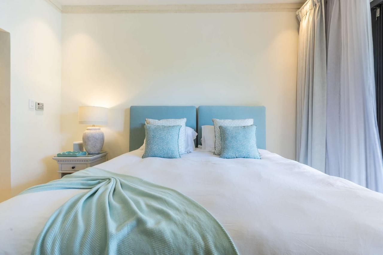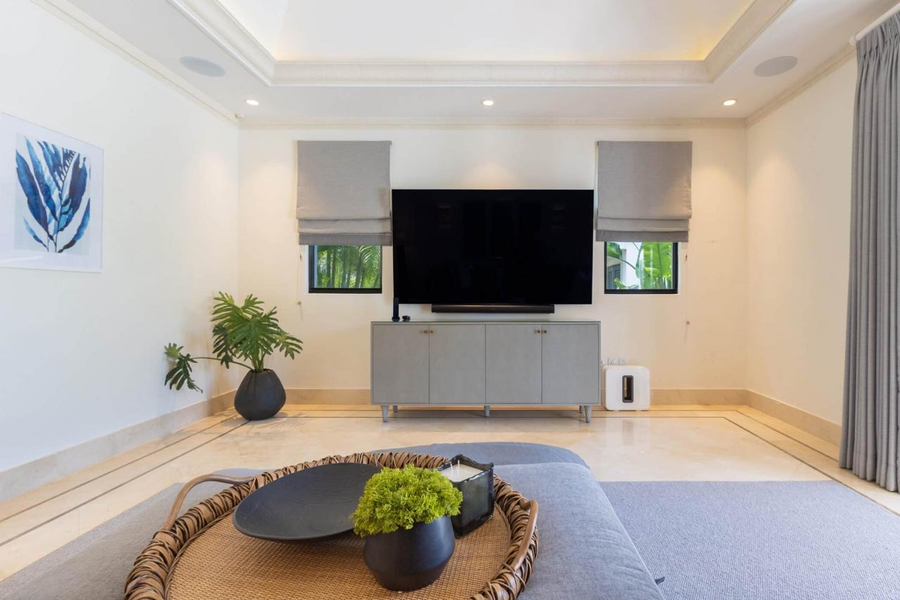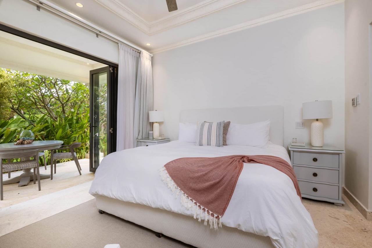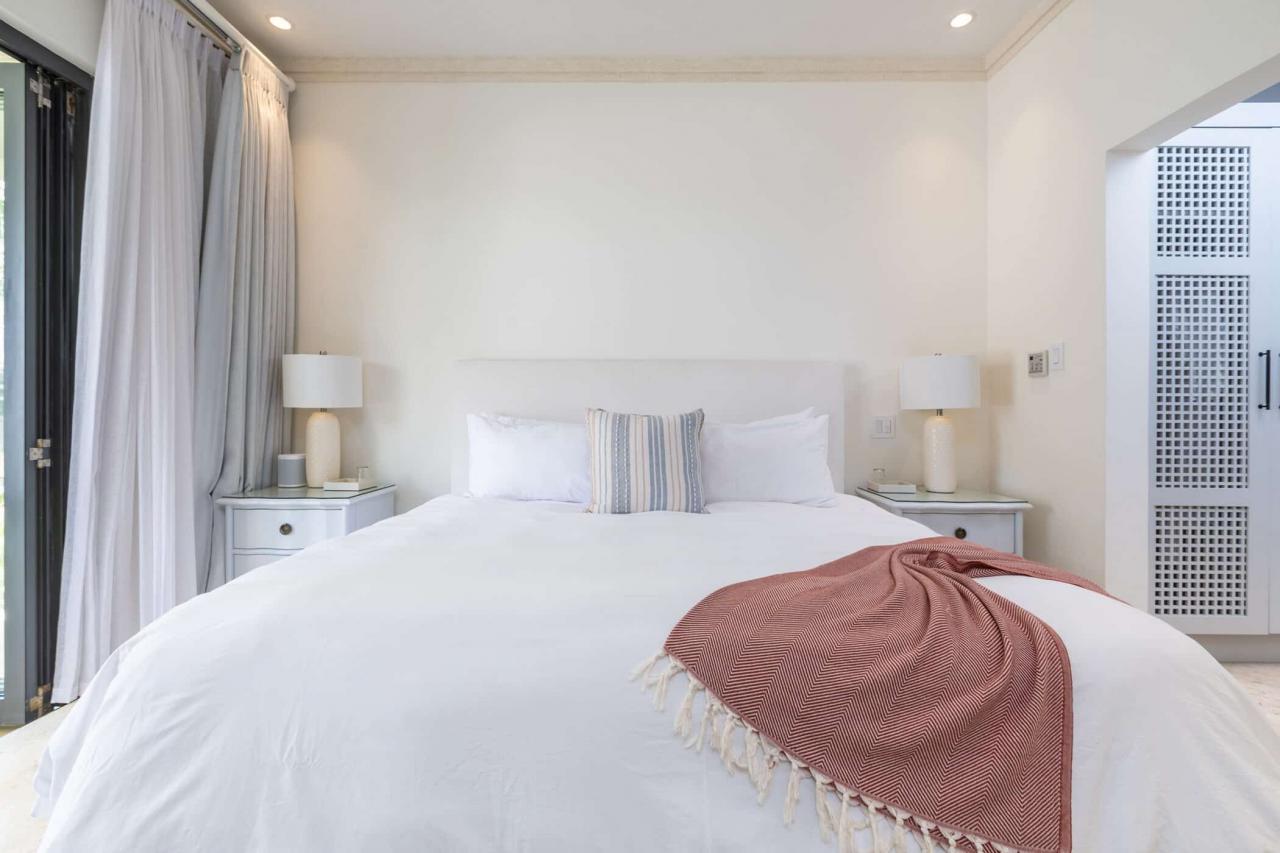 The villa’s interiors feature soaring ceilings, sleek contemporary furnishings, and carefully curated décor that create an atmosphere of understated luxury. A fully automated entertainment system, Apple TV, and Sonos sound system provide effortless modern convenience throughout. The main residence includes four beautifully appointed bedrooms, while a separate self-contained cottage offers two additional suites—ideal for guests or extended family seeking privacy. With three king suites and three twin bedrooms, the layout offers exceptional flexibility for families and larger groups.