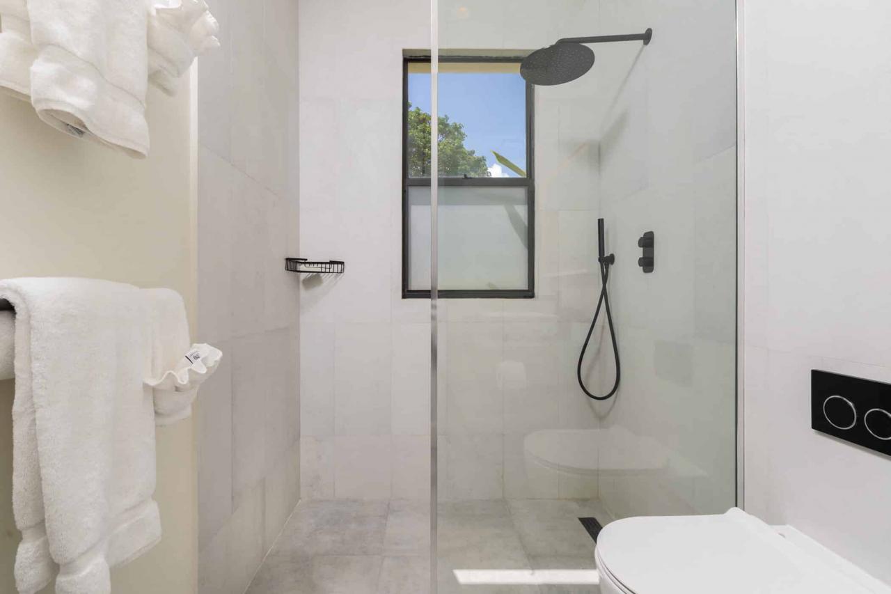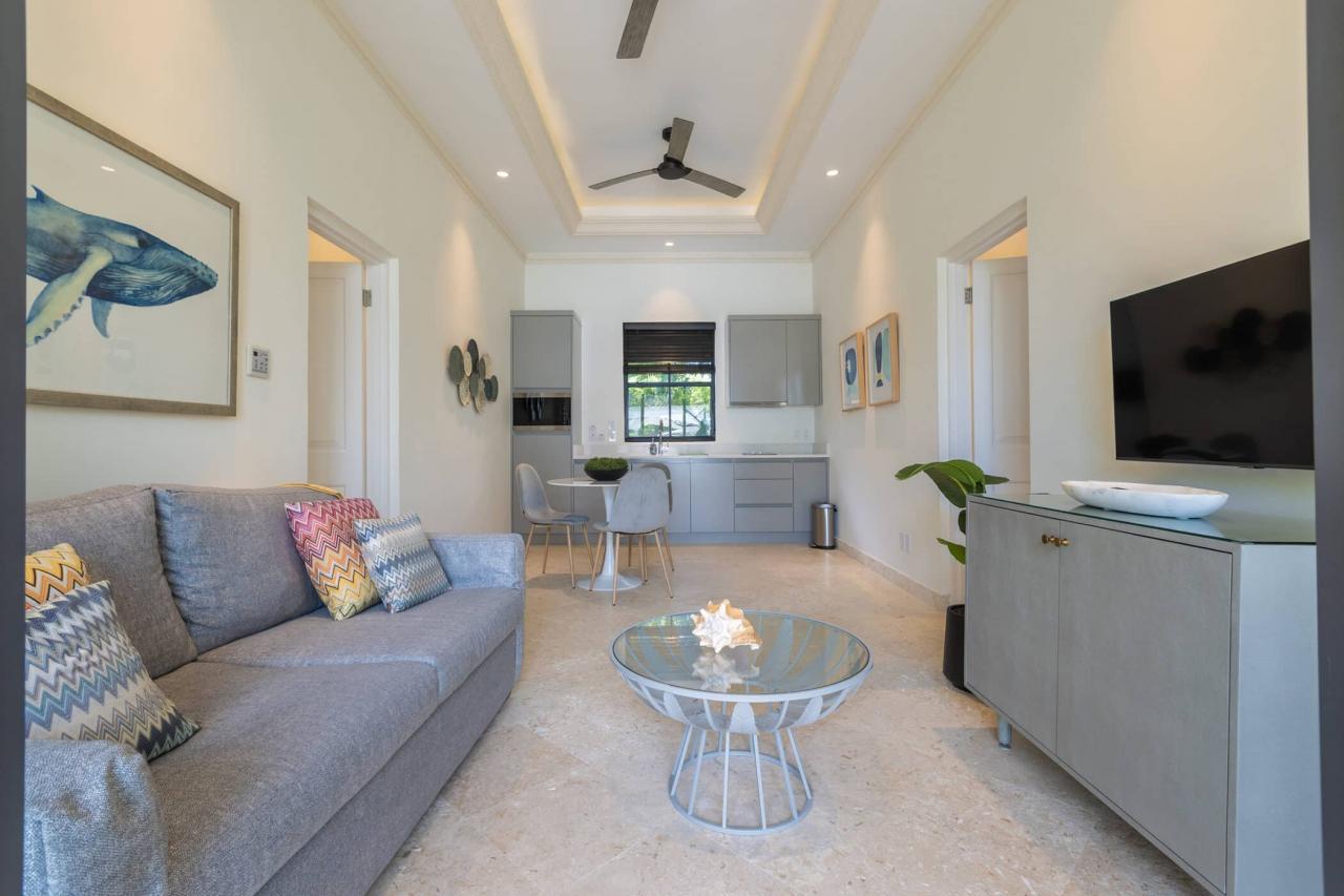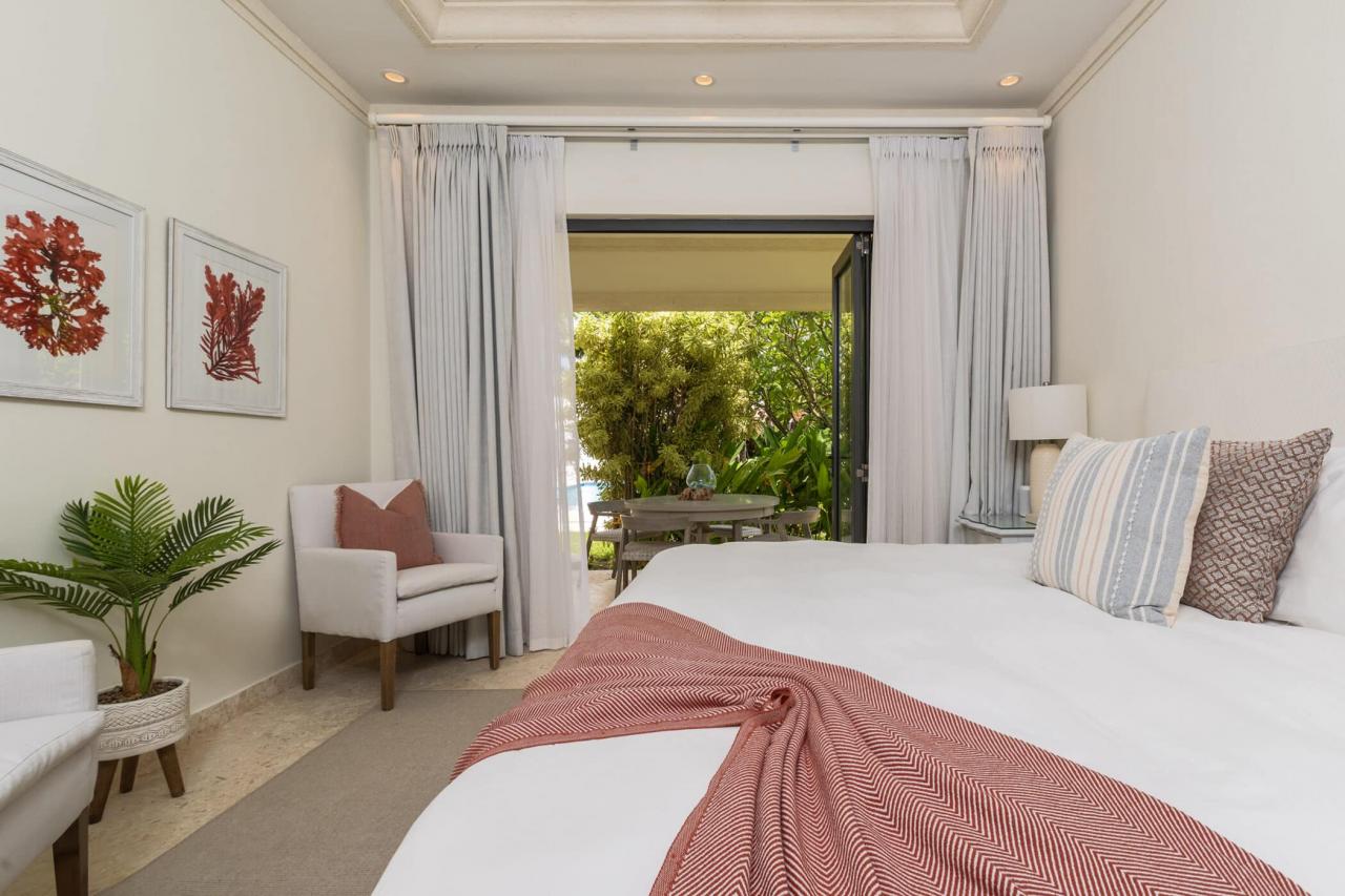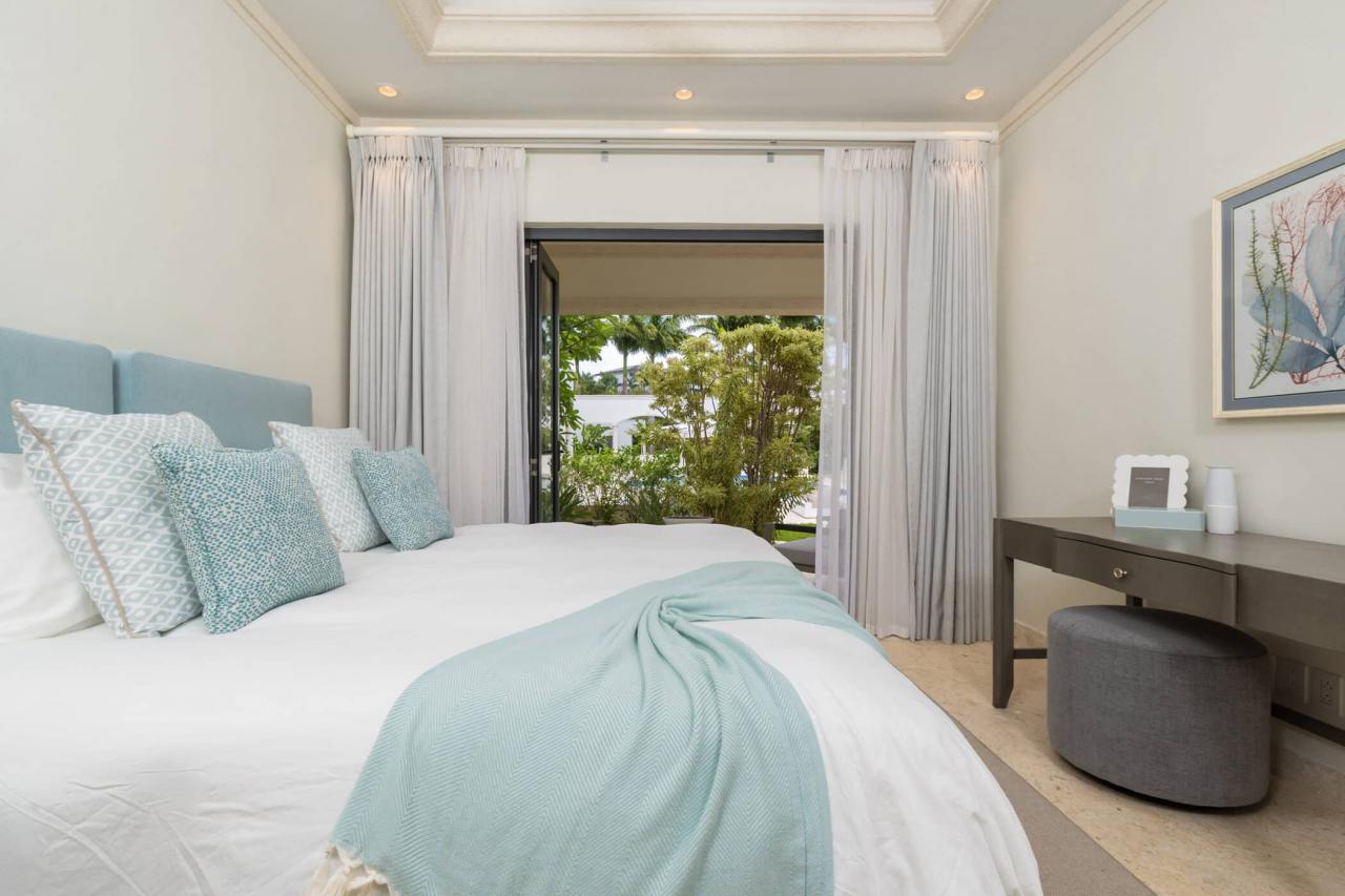 The villa’s interiors feature soaring ceilings, sleek contemporary furnishings, and carefully curated décor that create an atmosphere of understated luxury. A fully automated entertainment system, Apple TV, and Sonos sound system provide effortless modern convenience throughout. The main residence includes four beautifully appointed bedrooms, while a separate self-contained cottage offers two additional suites—ideal for guests or extended family seeking privacy. With three king suites and three twin bedrooms, the layout offers exceptional flexibility for families and larger groups.