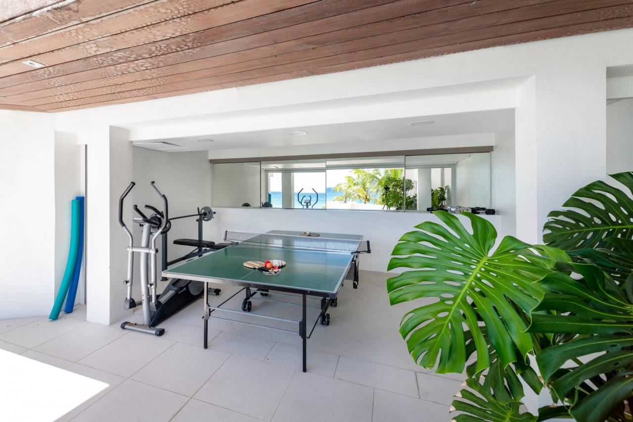Portobello Villa's modern interior and contemporary furnishings contrast wonderfully with the Caribbean's timeless beauty. The dramatic setting and captivating views of the fresh sea air will invigorate guests when they enter the villa. The villa also provides guests with the ultimate luxury, with an attentive staff to cater to every need. The fifth bedroom of Portobello Villa doubles as a media room to provide flexibility for entertaining or relaxing. There is table tennis and an outdoor gym reminiscent of Rocky's training for guests who enjoy being active. There is a bar equipped with a TV, which is the perfect place to enjoy the sunsets and transition into memorable evenings under the stars.