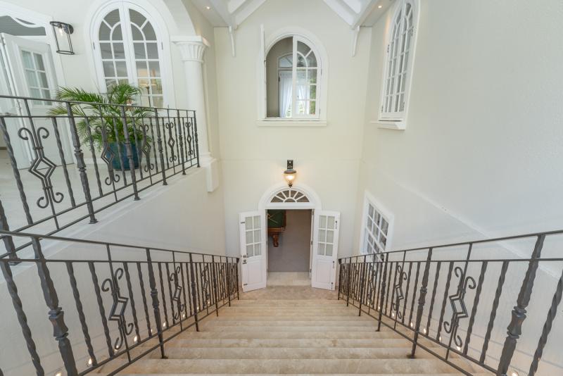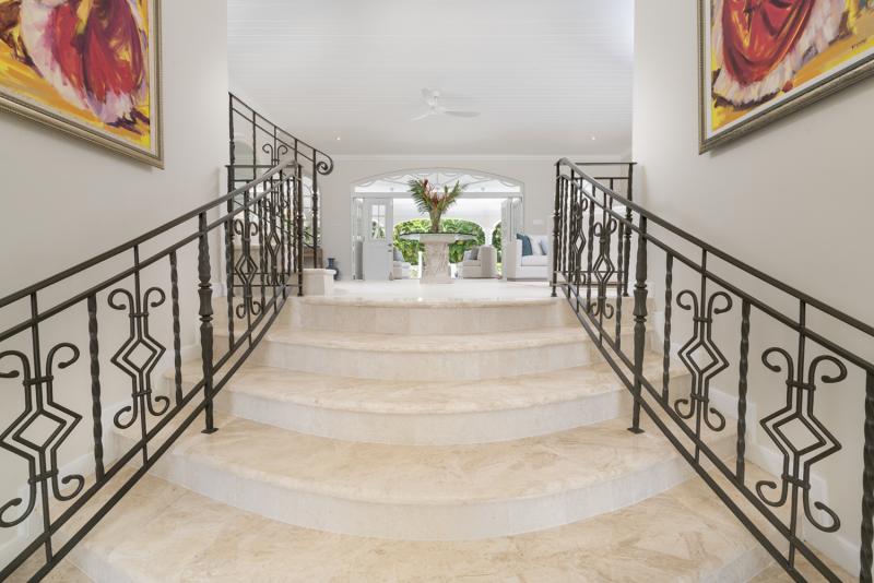 Serenity, a stunning Barbados villa rental, is situated on a tropical one-acre lot on the prestigious Sandy Lane Estate in the heart of the West Coast. The foyer greets guests with a waterfall feature and large double doors. From there, Serenity opens to spacious reception rooms and a formal dining room leading out onto the garden and pool terrace. The terrace has a bar and BBQ for outdoor fun and relaxation. An updated kitchen is also equipped with stainless steel appliances, stone countertops, a center island, and storage space. The kitchen leads to the laundry and staff facilities on the lower level and the three-car garage.