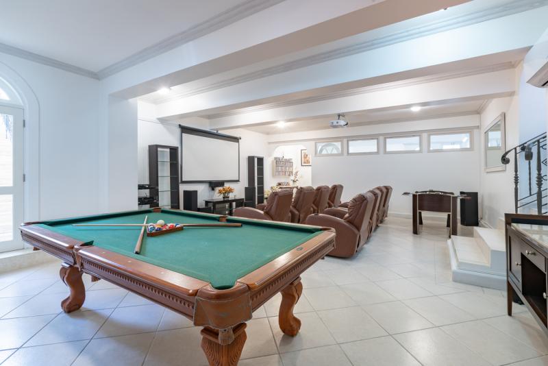 A generous living area and seven bedrooms across the three levels accommodate up to fourteen guests. Four suites are located on the main level, two of which have direct access to the pool deck, family room, powder room, and kitchen. The primary bedroom spans 1,400 sq. ft., the entire first floor, with balconies that overlook the pool deck and the Sandy Lane Estate. One side of this suite has his and hers closets, while the other is the ensuite bathroom with a jacuzzi tub. The final two bedrooms are located on the basement level, along with the home theatre.
