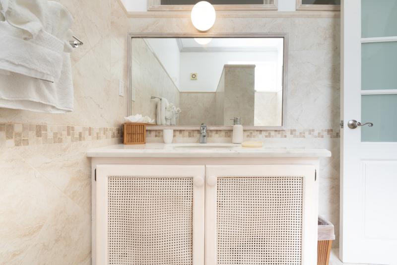 Bedroom 7: This room is equipped with a king-sized bed, air conditioning, a ceiling fan, and an ensuite bathroom with a walk-in shower with a filtered shower head and a vanity unit.
