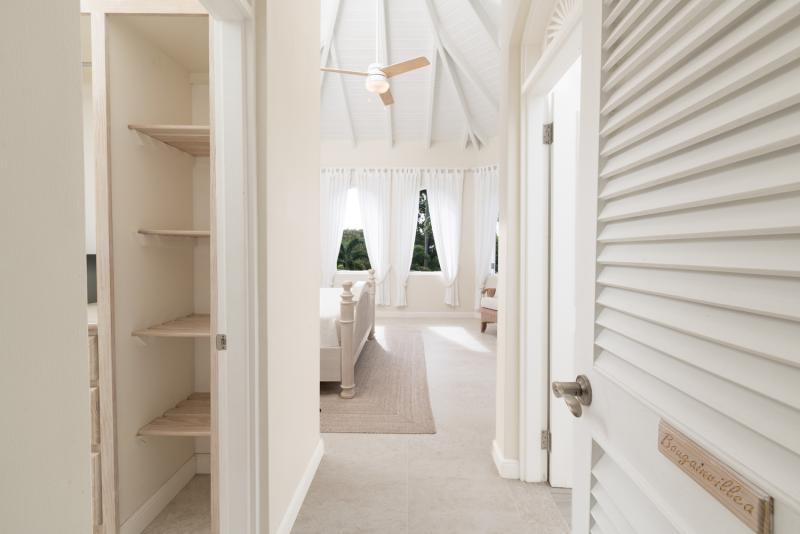 Bedroom 4: This room is equipped with a king-sized bed, a garden view, air conditioning, a ceiling fan, a TV, a safe, and an ensuite bathroom with a walk-in shower with a filtered showerhead, and a vanity unit.