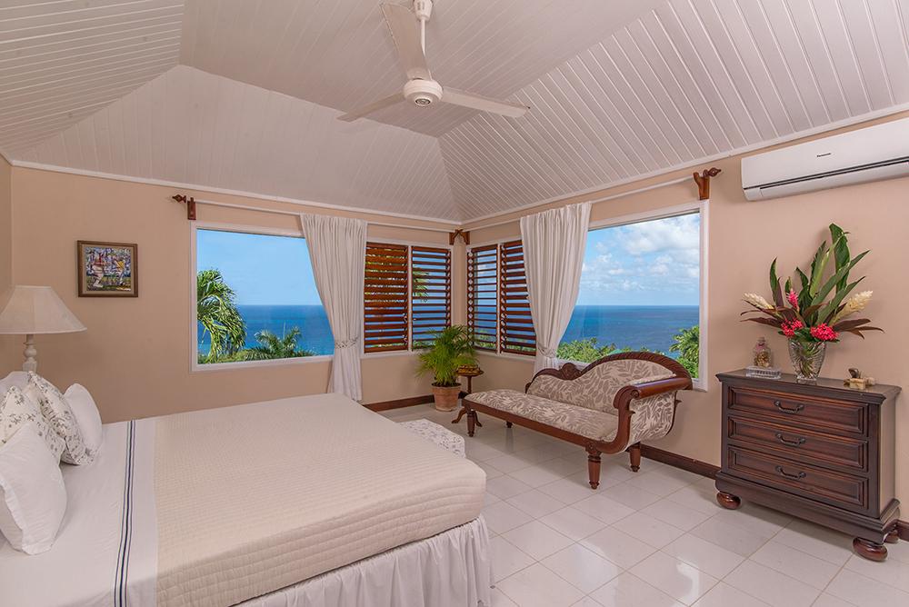 Upstairs is the bright master bedroom suite, commanding a stunning view of the tranquil harbor of Montego Bay and the lush mountains beyond.