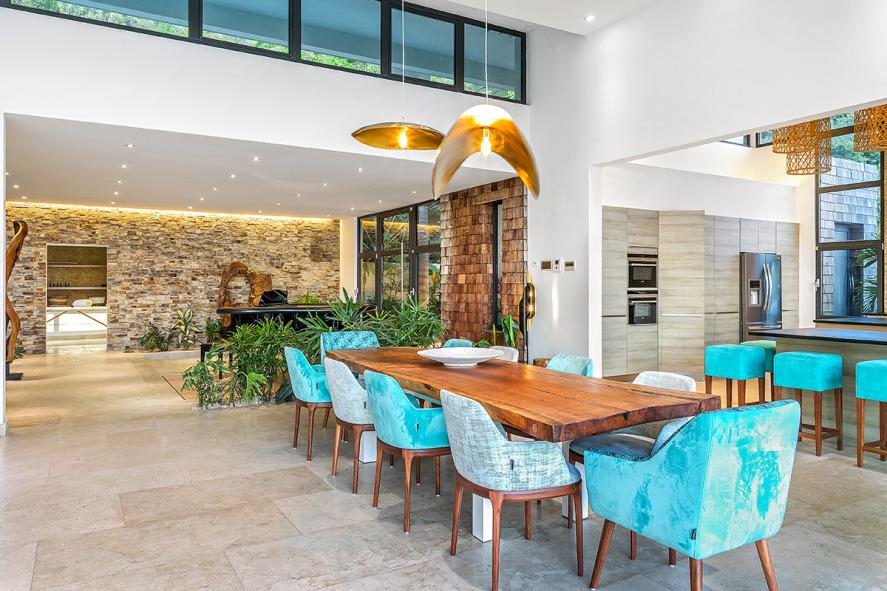 Find the magic of Emeraude upon entering, when you discover several indoor ponds filled with beautiful colorful fish creating a decorative and soothing water garden. This amazing entrance leads to a beautiful interior living space with high ceilings facing the swimming pool and the azur sea. An elegant yet comfortable living room blends with the outdoor ocean colours while the large solid wood dining table joins the space to the fully equipped kitchen with all the latest appliances. Special to the kitchen is the hidden pantry. Meals can also be taken outside around the beautiful table near the pool.