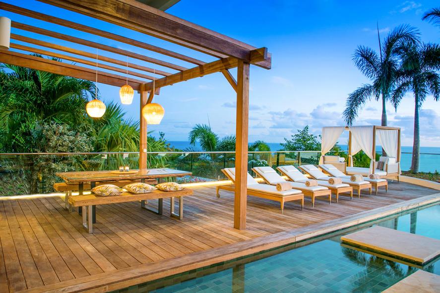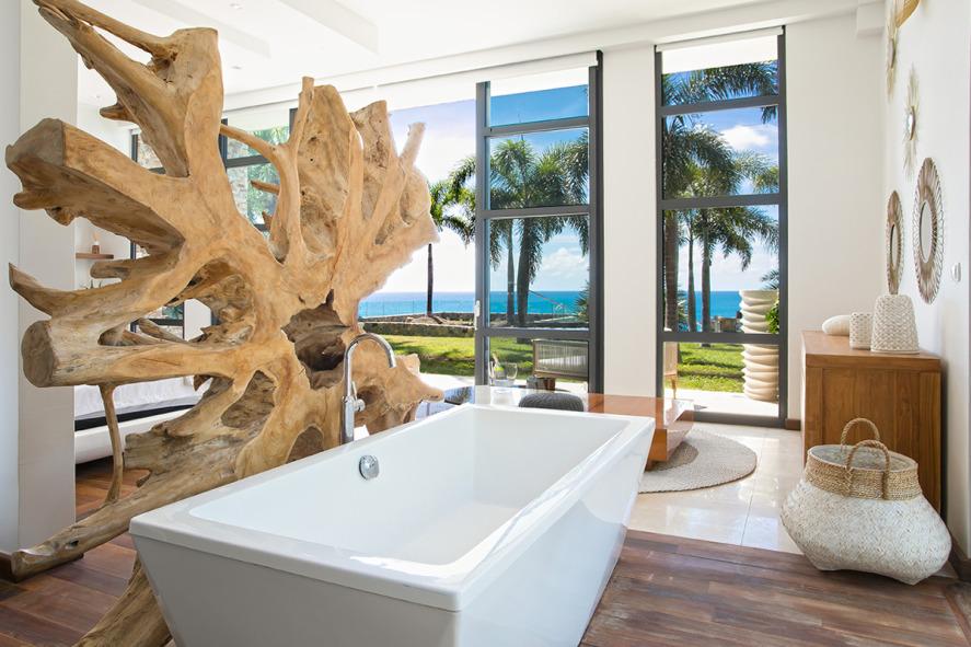 The villa has gorgeous outdoor spaces to enjoy the Caribbean tropical climate. A large shaded living space just steps from both the pool and the inside provides the perfect place to relax any time of the day. The beautiful infinity pool includes built in steps from the outdoor living room to the dining space. Another terrace features daybeds for a sunny spot to lounge by the pool and enjoy the views. At the end of the day, the villa is the perfect place to enjoy a bright and colorful sunset. Have a drink, get comfortable and enjoy the breathtaking view.