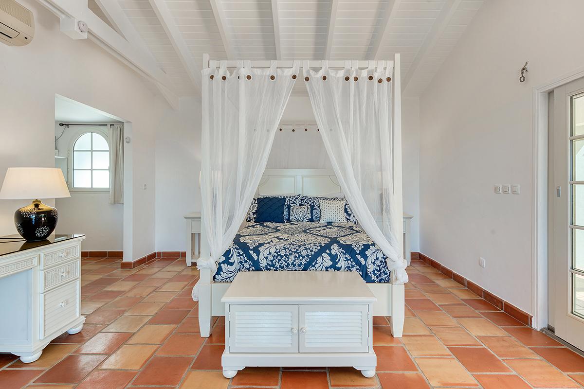 The four exterior access bedrooms are equal size and air conditioned. Two are placed at each end of the villa; one upper and one lower. The décor in each room is filled with airy, romantic style heightened by high vaulted ceiling and wicker, rattan or dark wood tropical furnishings accented with white and cream fabrics. Every room has sea or pool views plus private terraces and interior seating. The bathrooms are uniquely decorated in richly colored traditional tiles and sinks from Provence. From the oversized double showers, you view the ocean and gardens.