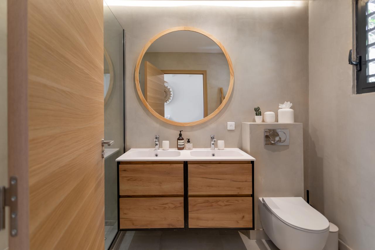 At the heart of the villa lies a heated pool overlooking the turquoise bay, inviting swims at any hour surrounded by endless ocean hues. The three king-bedded bedrooms are thoughtfully designed for both comfort and tranquility. The primary suite offers breathtaking sea views and a private en-suite, while the other two share a sleek, modern bathroom—one with direct access to the terrace for sunrise views. The kitchen, fully equipped and elegantly open, serves as the social hub of the home, where a central island and panoramic windows make even casual meals feel luxurious.