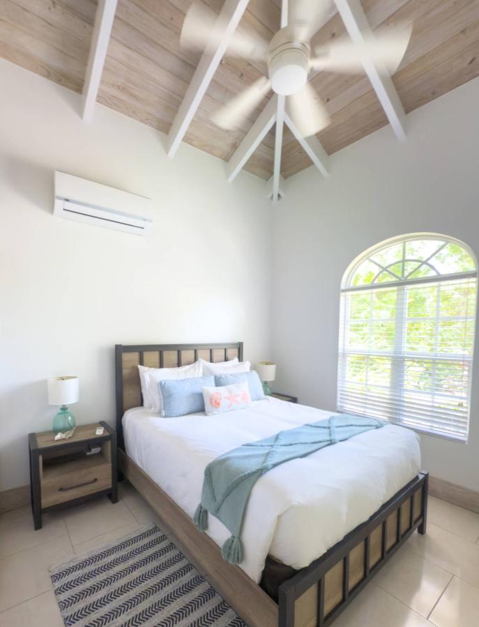 Inside, the villa is thoughtfully arranged to accommodate up to six guests in comfort. The primary suite includes a king bed, walk-in closet, and ensuite bathroom, while the additional bedrooms—one with a queen bed and the other with two twins—share a second full bathroom. A fully equipped kitchen with KitchenAid appliances, along with a washer and dryer, ensures convenience for longer stays or in-villa dining. Modern amenities such as WiFi, a smart TV, and beach essentials further enhance the experience.