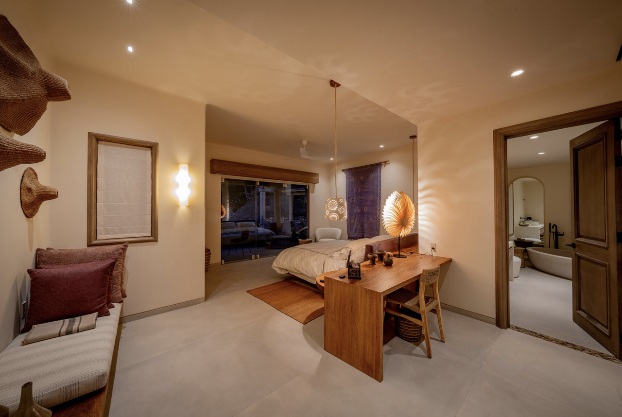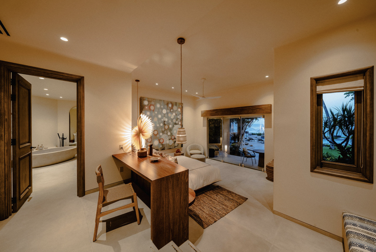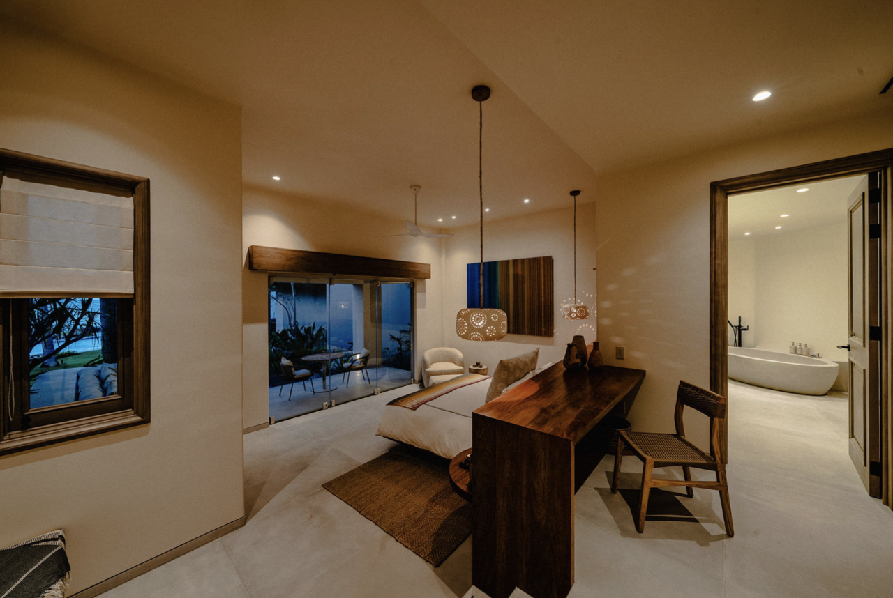 - Bedroom 4: King bed, en suite bathroom with stand along shower & bathtub, walk-in closet, TV, AC, desk, safe, ceiling fan, private terrace, access to pool area, ocean view