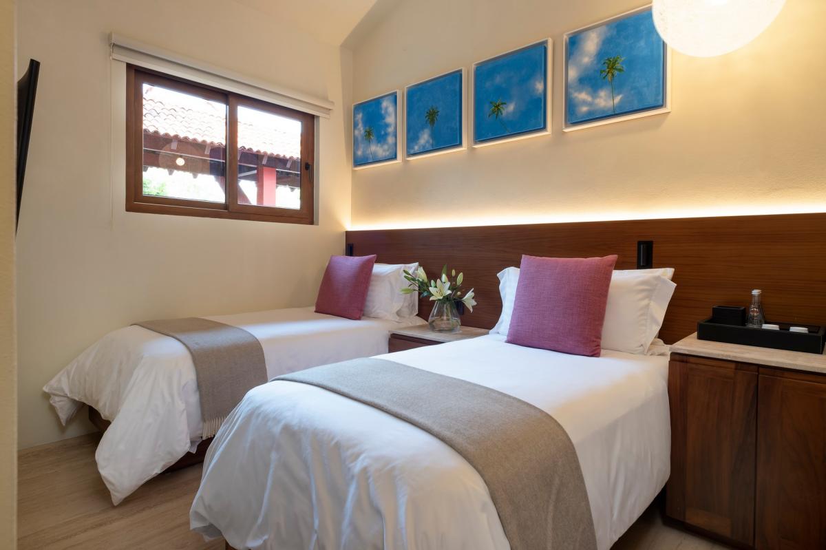 Bugambilias Suite 2: This spacious garden view suite offers two full-size beds, a television and Apple TV, personal security safe, an in-room minibar, a Nespresso® Coffee maker, and an ensuite bathroom with shower. The private patio offers a seating area and an outdoor shower. This suite can convert into One King Size and One Full-Size Bed or a double-size king bed with custom bed linens and is an excellent room to accommodate several younger guests.